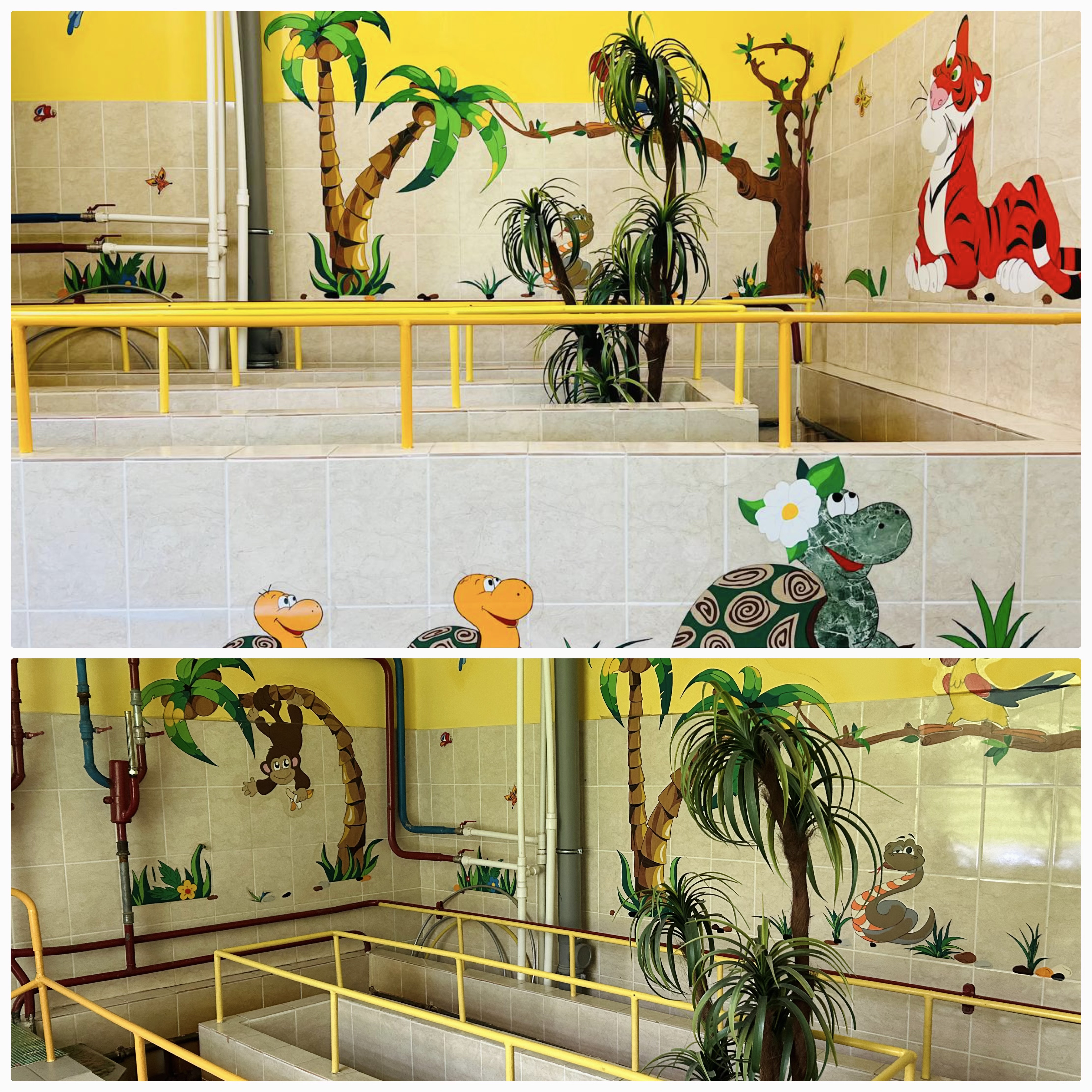 Установлены умывальные раковины с подводкой горячей и холодной воды для детей. В группах раннего возраста рядом с умывальниками установлены вешалки для детских полотенец (индивидуально для каждого ребенка имеется промаркированное полотенце), кроме того, в умывальных установлены душевой поддон, умывальная раковина для персонала, шкаф для хозяйственно-бытового инвентаря |