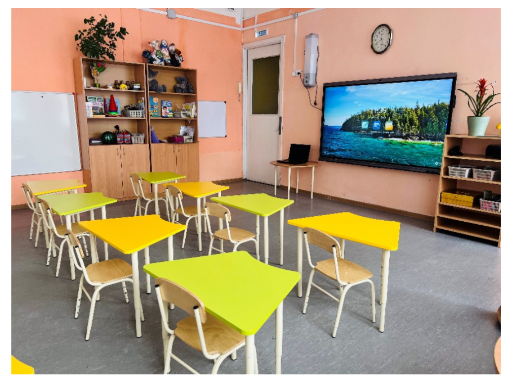 1 | Интерактивная панель Lumien 02ELN – 1 шт., магнитная доска – 1 шт., детские столы «Ромашка» 2 шт. ( на 12 детей), детские стулья – 12 шт., стеллажи для пособий и атрибутов, мольберт – 2 шт., флипчарт – 1 шт. | Специально оборудованных учебных кабинетов для обучения инвалидов и детей с ограниченными возможностями здоровья нет |