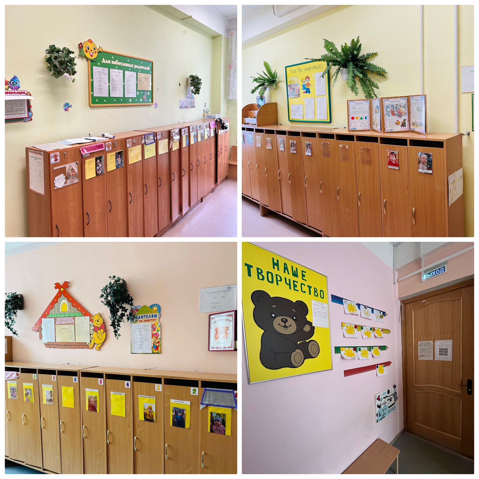 Раздевальные оборудованы шкафами для детей и персонала (шкаф предоставляется индивидуально для каждого ребенка и имеет полку для головных уборов, крючок для верхней одежды и полку для обуви). Каждая индивидуальная ячейка промаркирована. Также в приемной расположены информационные уголки для родителей воспитанников, которые содержат информацию для родителей: консультации, рекомендации специалистов и т.п. |